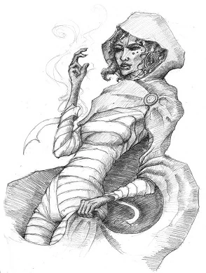 Ishri is a tall dark-skinned woman with perfect white teeth and black eyes. She moves with an improbable nimbleness, and dresses her impossibly thin body in white bandages from neck to toe, often covered in a long coat. She delights in startling and provoking people.