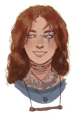 Rikke has a wild tangle of red-brown hair, a wide expressive face, and excellent teeth[1]. Her most distinctive feature is her eyes, huge and pale and almost overly-expressive. She has a thick gold ring through her freckled nose (“it keeps me tethered”), and a cross of dark paint over her left eye ("a goodly mark much loved by the moon”). She also wears a rattling mass of beads, charms and talismans around her neck, including a well-bitten dowel for her fits[2].